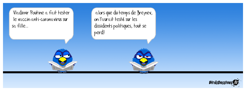 Case 1:Bird 1: Vladimir Poutine a fait tester le vaccin anti-coronavirus sur sa fille.. | Case 2: Bird 1: alors que du temps de Brejnev, on l'aurait testé sur les dissidents politiques, tout se perd! | Case 3: