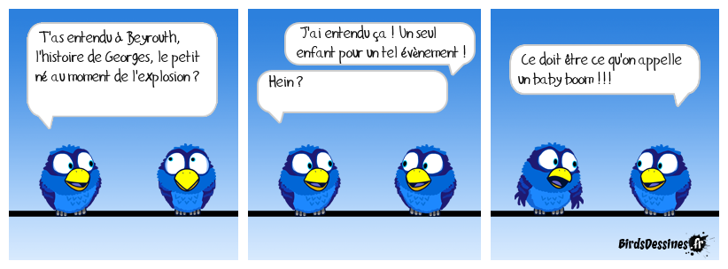 Case 1:Bird 1: T'as entendu à Beyrouth, l'histoire de Georges, le petit né au moment de l'explosion ? | Case 2: Bird 1: J'ai entendu ça ! Un seul enfant pour un tel évènement ! Bird 2: Hein ? | Case 3: Bird 1: Ce doit être ce qu'on appelle un baby boom !!!