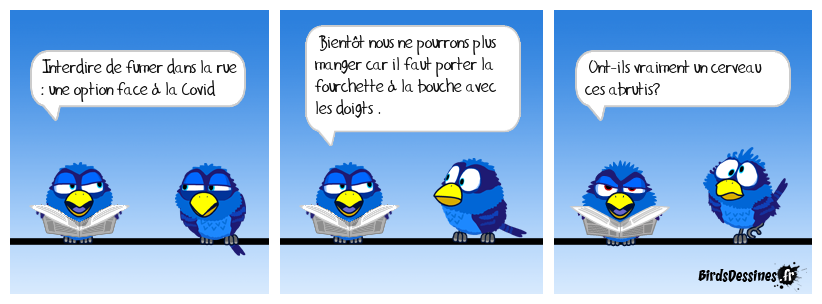 Case 1:Bird 1: Interdire de fumer dans la rue : une option face à la Covid | Case 2: Bird 1: Bientôt nous ne pourrons plus manger car il faut porter la fourchette à la bouche avec les doigts . | Case 3: Bird 1: Ont-ils vraiment un cerveau ces abrutis?