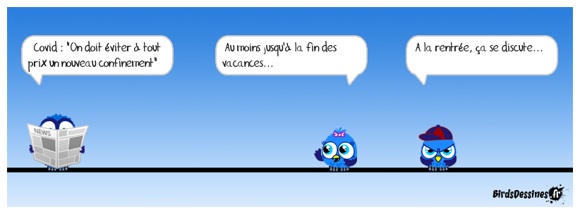 Case 1:Bird 1: Covid : "On doit éviter à tout prix un nouveau confinement" | Case 2: Bird 1: Au moins jusqu'à la fin des vacances... | Case 3: Bird 1: A la rentrée, ça se discute...