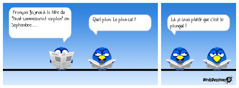 Case 1:Bird 1: François Bayrou à la tête du "haut commissariat au plan" en Septembre.... | Case 2: Bird 1: Quel plan. Le plan cul ? | Case 3: Bird 1: Là je crois plutôt que c'est le planqué !