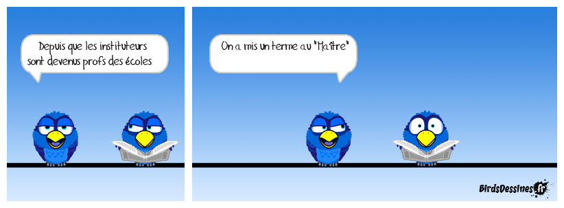 Case 1:Bird 1: Depuis que les instituteurs sont devenus profs des écoles | Case 2: Bird 1: On a mis un terme au "Maïtre" | Case 3: