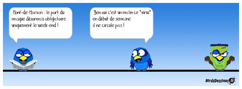 Case 1:Bird 1: Mont-de-Marsan : le port du masque désormais obligatoire uniquement le week-end ! | Case 2: Bird 1: Ben oui c'est un malin ce "virus" en début de semaine il ne circule pas ! | Case 3: