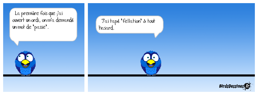 Case 1:Bird 1: La première fois que j'ai ouvert un ordi, on m'a demandé un mot de "passe". | Case 2: Bird 1: J'ai tapé "fellation" à tout hasard. | Case 3: