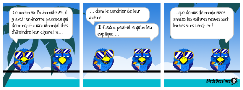 Case 1:Bird 1: Ce matin sur l'autoroute A9, il y avait un énorme panneau qui demandait aux automobilistes d'éteindre leur cigarette... | Case 2: Bird 1: ... dans le cendrier de leur voiture.... Bird 2: Il faudra peut-être qu'on leur explique.... | Case 3: Bird 1: ...que depuis de nombreuses années les voitures neuves sont livrées sans cendrier !