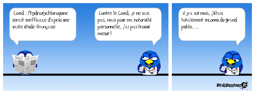 Case 1:Bird 1: Covid : l'hydroxychloroquine serait inefficace d'après une vaste étude française | Case 2: Bird 1: Contre le Covid, je ne sais pas, mais pour ma notoriété personnelle, j'ai pas trouvé mieux ! | Case 3: Bird 1: il y a six mois, j'étais totalement inconnu du grand public ...