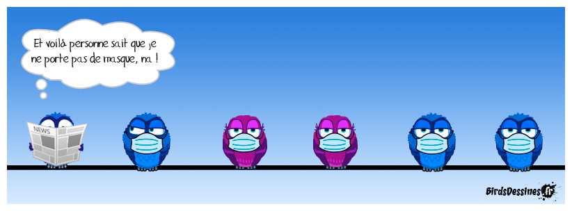 Case 1:Bird 1: Et voilà personne sait que je ne porte pas de masque, na ! | Case 2: | Case 3: