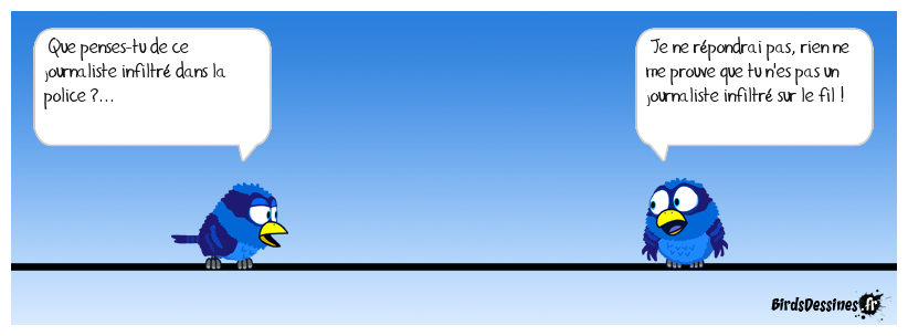 Case 1:Bird 1: Que penses-tu de ce journaliste infiltré dans la police ?... | Case 2: | Case 3: Bird 1: Je ne répondrai pas, rien ne me prouve que tu n'es pas un journaliste infiltré sur le fil !