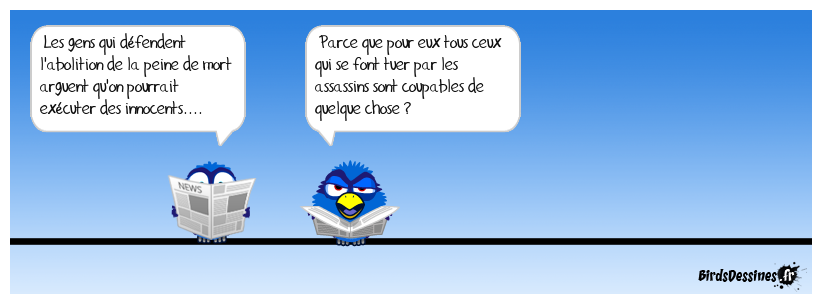 Case 1:Bird 1: Les gens qui défendent l'abolition de la peine de mort arguent qu'on pourrait exécuter des innocents.... | Case 2: Bird 1: Parce que pour eux tous ceux qui se font tuer par les assassins sont coupables de quelque chose ? | Case 3: