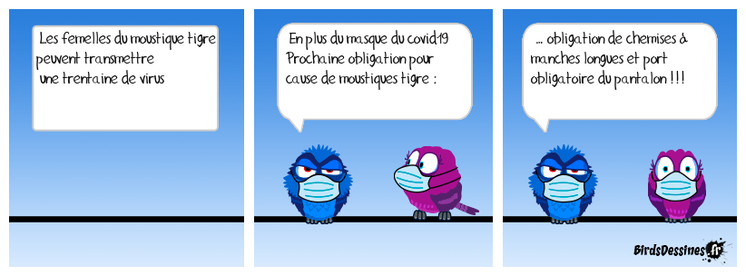 Case 1:Bird 1: Les femelles du moustique tigre peuvent transmettre une trentaine de virus | Case 2: Bird 1: En plus du masque du covid19 Prochaine obligation pour cause de moustiques tigre : | Case 3: Bird 1: … obligation de chemises à manches longues et port obligatoire du pantalon !!!