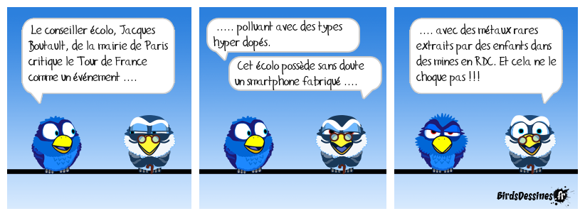 Case 1:Bird 1: Le conseiller écolo, Jacques Boutault, de la mairie de Paris critique le Tour de France comme un événement .... | Case 2: Bird 1: ..... polluant avec des types hyper dopés. Bird 2: Cet écolo possède sans doute un smartphone fabriqué .... | Case 3: Bird 1: .... avec des métaux rares extraits par des enfants dans des mines en RDC. Et cela ne le choque pas !!!