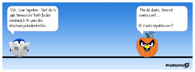 Case 1:Bird 1: USA , Cour Suprême : Mort de la juge Démocrate Ruth Bader Ginsburg à 45 jours des élections présidentielles... | Case 2: | Case 3: Bird 1: Plus de doute, Dieu est américain!!... Et il vote républicain !!