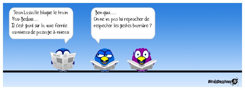 Case 1:Bird 1: Jean Lassalle bloque le train Pau-Bedous... Il s'est garé sur la voie ferrée au niveau de passage à niveau | Case 2: Bird 1: Ben quoi.... On ne va pas lui reprocher de respecter les gestes barrière ? | Case 3: