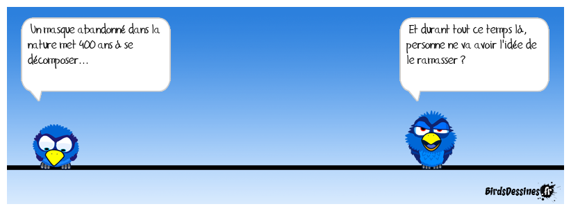 Case 1:Bird 1: Un masque abandonné dans la nature met 400 ans à se décomposer... | Case 2: | Case 3: Bird 1: Et durant tout ce temps là, personne ne va avoir l'idée de le ramasser ?