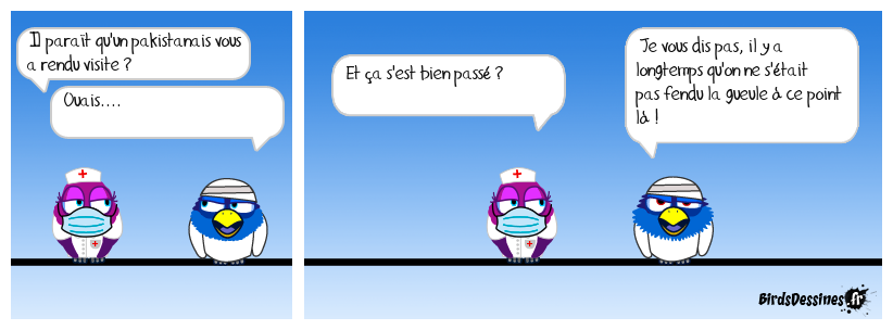 Case 1:Bird 1: Il paraît qu'un pakistanais vous a rendu visite ? Bird 2: Ouais.... | Case 2: Bird 1: Et ça s'est bien passé ? | Case 3: Bird 1: Je vous dis pas, il y a longtemps qu'on ne s'était pas fendu la gueule à ce point là !