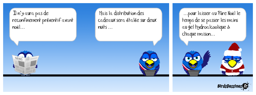 Case 1:Bird 1: Il n’y aura pas de reconfinement préventif avant noël... | Case 2: Bird 1: Mais la distribution des cadeaux sera étalée sur deux nuits ... | Case 3: Bird 1: ...pour laisser au Père Noël le temps de se passer les mains au gel hydroalcoolique à chaque maison...