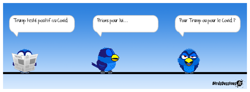 Case 1:Bird 1: Trump testé positif au Covid | Case 2: Bird 1: Prions pour lui... | Case 3: Bird 1: Pour Trump ou pour le Covid ?