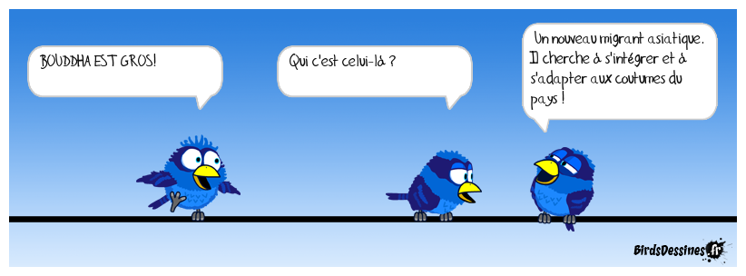 Case 1:Bird 1: BOUDDHA EST GROS! | Case 2: Bird 1: Qui c'est celui-là ? | Case 3: Bird 1: Un nouveau migrant asiatique. Il cherche à s'intégrer et à s'adapter aux coutumes du pays !