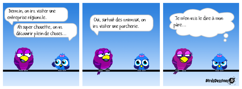 Case 1:Bird 1: Demain, on ira visiter une entreprise régionale.Bird 2: Ah super chouette, on va découvrir plein de choses... | Case 2: Bird 1: Oui, surtout des animaux, on ira visiter une porcherie. | Case 3: Bird 1: Je m'en vais le dire à mon père...