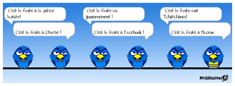 Case 1:Bird 1: C'est la faute à la justice laxiste!Bird 2: C'est la faute à Charlie ! | Case 2: Bird 1: c'est la faute au gouvernement ! Bird 2: C'est la faute à Facebook ! | Case 3: Bird 1: C'est la faute aux Tchétchènes! Bird 2: C'est la faute à Macron