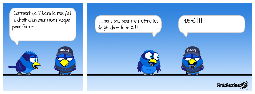 Case 1:Bird 1: Comment ça ? Dans la rue j'ai le droit d'enlever mon masque pour fumer,... | Case 2: Bird 1: ...mais pas pour me mettre les doigts dans le nez !! | Case 3: Bird 1: 135 € !!!