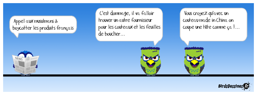 Case 1:Bird 1: Appel aux musulmans à boycotter les produits français | Case 2: Bird 1: C'est dommage, il va falloir trouver un autre fournisseur pour les couteaux et les feuilles de boucher... | Case 3: Bird 1: Vous croyez qu'avec un couteau made in China on coupe une tête comme ça !...
