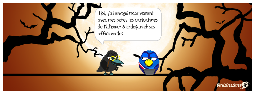 Case 1: | Case 2: Bird 1: Moi, j'ai envoyé massivement avec mes potes les caricatures de Mahomet à Erdogan et ses afficionados | Case 3: