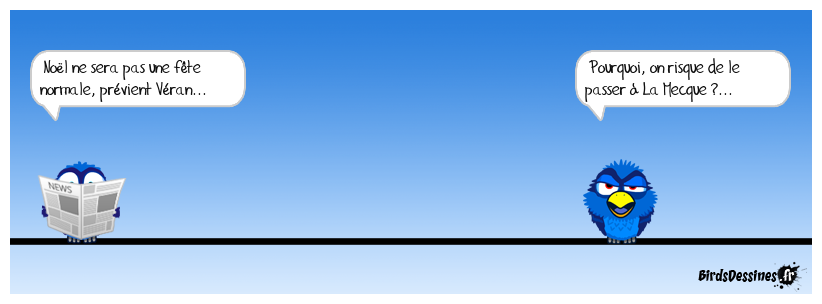 Case 1:Bird 1: Noël ne sera pas une fête normale, prévient Véran... | Case 2: | Case 3: Bird 1: Pourquoi, on risque de le passer à La Mecque ?...