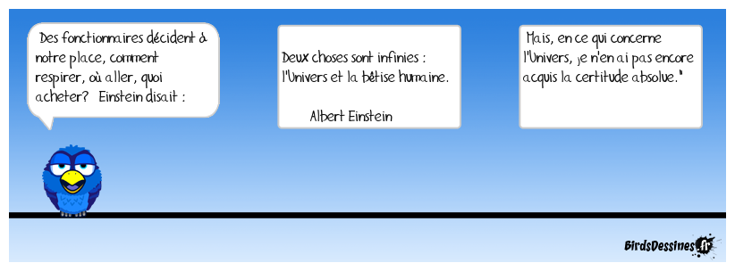 Case 1:Bird 1: Des fonctionnaires décident à notre place, comment respirer, où aller, quoi acheter? Einstein disait : | Case 2: Bird 1: Deux choses sont infinies : l'Univers et la bêtise humaine. Albert Einstein | Case 3: Bird 1: Mais, en ce qui concerne l'Univers, je n'en ai pas encore acquis la certitude absolue."