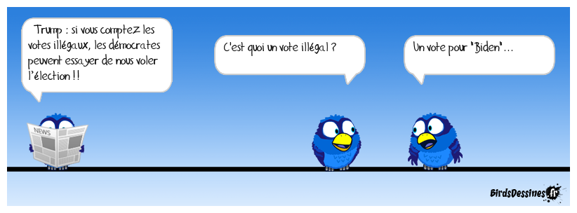 Case 1:Bird 1: Trump : si vous comptez les votes illégaux, les démocrates peuvent essayer de nous voler l’élection !! | Case 2: Bird 1: C'est quoi un vote illégal ? | Case 3: Bird 1: Un vote pour "Biden"...