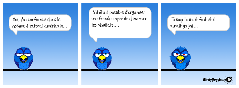 Case 1:Bird 1: Moi, j'ai confiance dans le système électoral américain... | Case 2: Bird 1: S'il était possible d'organiser une fraude capable d'inverser les résultats,... | Case 3: Bird 1: Trump l'aurait fait et il aurait gagné...