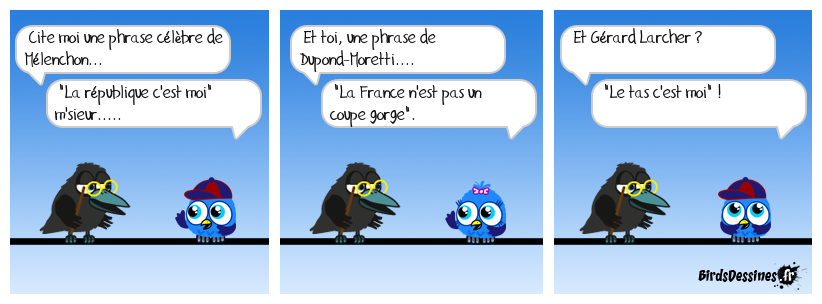 Case 1:Bird 1: Cite moi une phrase célèbre de Mélenchon...Bird 2: "La république c'est moi" m'sieur..... | Case 2: Bird 1: Et toi, une phrase de Dupond-Moretti.... Bird 2: "La France n'est pas un coupe gorge". | Case 3: Bird 1: Et Gérard Larcher ? Bird 2: "Le tas c'est moi" !