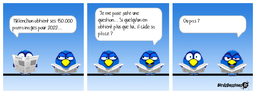 Case 1:Bird 1: Mélenchon obtient ses 150.000 parrainages pour 2022... | Case 2: Bird 1: Je me pose juste une question... Si quelqu'un en obtient plus que lui, il cède sa place ? | Case 3: Bird 1: Ou pas ?