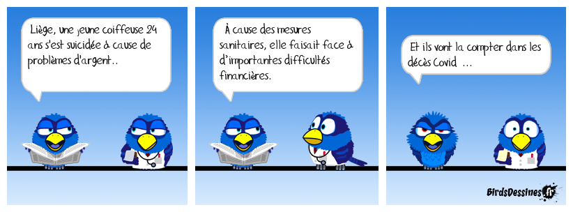 Case 1:Bird 1: Liège, une jeune coiffeuse 24 ans s'est suicidée à cause de problèmes d'argent.. | Case 2: Bird 1: À cause des mesures sanitaires, elle faisait face à d’importantes difficultés financières. | Case 3: Bird 1: Et ils vont la compter dans les décès Covid ...