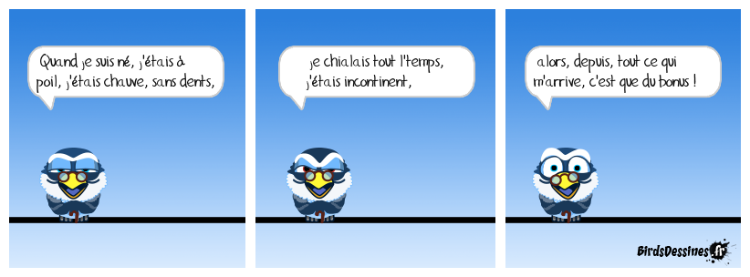 Case 1:Bird 1: Quand je suis né, j'étais à poil, j'étais chauve, sans dents, | Case 2: Bird 1: je chialais tout l'temps, j'étais incontinent, | Case 3: Bird 1: alors, depuis, tout ce qui m'arrive, c'est que du bonus !