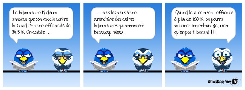 Case 1:Bird 1: Le laboratoire Moderna annonce que son vaccin contre la Covid-19 a une efficacité de 94.5 %. On assiste ... | Case 2: Bird 1: .....tous les jours à une surenchère des autres laboratoires qui annoncent beaucoup mieux. | Case 3: Bird 1: Quand le vaccin sera efficace à plus de 100 %, on pourra vacciner son entourage, rien qu’en postillonnant !!!