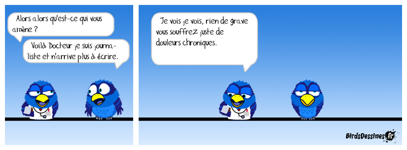 Case 1:Bird 1: Alors alors qu'est-ce qui vous amène ?Bird 2: Voilà Docteur je suis journa- liste et n'arrive plus à écrire. | Case 2: Bird 1: Je vois je vois, rien de grave vous souffrez juste de douleurs chroniques. | Case 3: