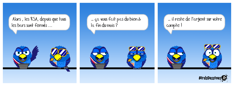 Case 1:Bird 1: Alors , les RSA, depuis que tous les bars sont fermés ... | Case 2: Bird 1: … ça vous fait pas du bien à la fin du mois ? | Case 3: Bird 1: … il reste de l'argent sur votre compte !
