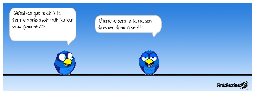 Case 1:Bird 1: Qu'est-ce que tu dis à ta femme après avoir fait l'amour sauvagement ??? | Case 2: Bird 1: Chérie je serai à la maison dans une demi-heure!! Bird 2: Qu'est-ce que tu dis à ta femme après l'amour? | Case 3: