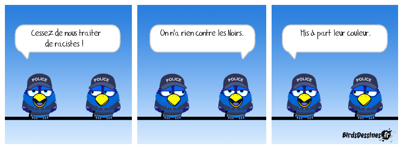 Case 1:Bird 1: Cessez de nous traiter de racistes ! | Case 2: Bird 1: On n'a rien contre les Noirs. | Case 3: Bird 1: Mis à part leur couleur.