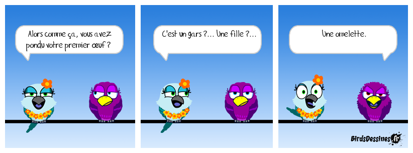 Case 1:Bird 1: Alors comme ça, vous avez pondu votre premier œuf ? | Case 2: Bird 1: C'est un gars ?... Une fille ?... | Case 3: Bird 1: Une omelette.
