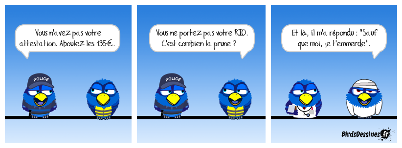 Case 1:Bird 1: Vous n'avez pas votre attestation. Aboulez les 135€. | Case 2: Bird 1: Vous ne portez pas votre RIO. C'est combien la prune ? | Case 3: Bird 1: Et là, il m'a répondu : "Sauf que moi, je t'emmerde".
