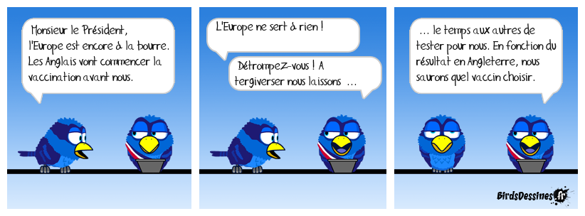 Case 1:Bird 1: Monsieur le Président, l'Europe est encore à la bourre. Les Anglais vont commencer la vaccination avant nous. | Case 2: Bird 1: L'Europe ne sert à rien ! Bird 2: Détrompez-vous ! A tergiverser nous laissons ... | Case 3: Bird 1: ... le temps aux autres de tester pour nous. En fonction du résultat en Angleterre, nous saurons quel vaccin choisir.