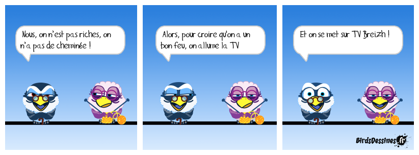Case 1:Bird 1: Nous, on n’est pas riches, on n’a pas de cheminée ! | Case 2: Bird 1: Alors, pour croire qu'on a un bon feu, on allume la TV | Case 3: Bird 1: Et on se met sur TV Breizh !