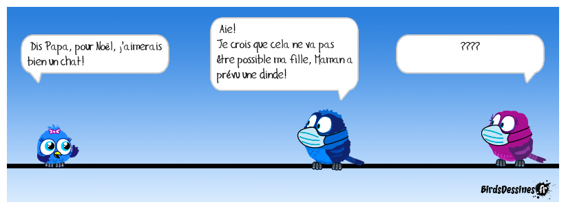 Case 1:Bird 1: Dis Papa, pour Noël, j'aimerais bien un chat! | Case 2: Bird 1: Aie! Je crois que cela ne va pas être possible ma fille, Maman a prévu une dinde! | Case 3: Bird 1: ????