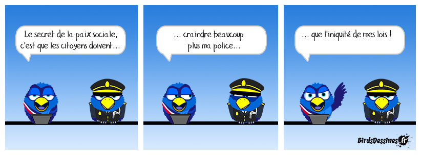 Case 1:Bird 1: Le secret de la paix sociale, c'est que les citoyens doivent... | Case 2: Bird 1: ... craindre beaucoup plus ma police... | Case 3: Bird 1: ... que l'iniquité de mes lois !