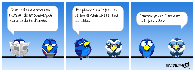 Case 1:Bird 1: Jean Castex a annoncé un maximum de six convives pour les repas de fin d’année. | Case 2: Bird 1: Pas plus de six à table, les personnes vulnérables en bout de table… | Case 3: Bird 1: Comment je vais faire avec ma table ronde ?