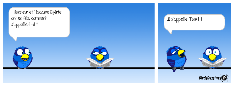 Case 1:Bird 1: Monsieur et Madame Egérie ont un fils, comment s'appelle-t-il ? | Case 2: | Case 3: Bird 1: Il s'appelle Tom ! !