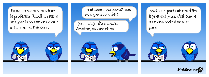 Case 1:Bird 1: Eh oui, mesdames, messieurs, le professeur Raoult a réussi à analyser la souche virale qui a atteint notre Président. | Case 2: Bird 1: Professeur, que pouvez-vous nous dire à ce sujet ? Bird 2: Ben, il s'agit d'une souche évolutive, un variant qui... | Case 3: Bird 1: possède la particularité d'être légèrement jauni, c'est comme si ce virus portait un gilet jaune.
