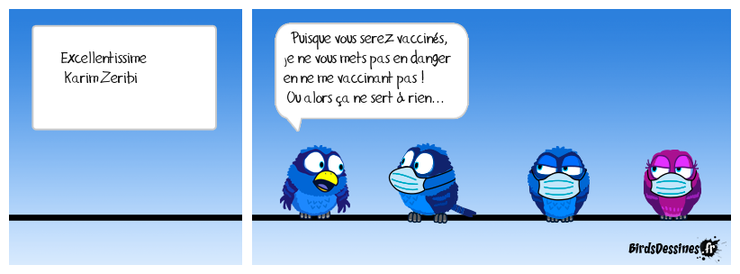 Case 1:Bird 1: Excellentissime Karim Zeribi | Case 2: Bird 1: Puisque vous serez vaccinés, je ne vous mets pas en danger en ne me vaccinant pas ! Ou alors ça ne sert à rien... | Case 3:
